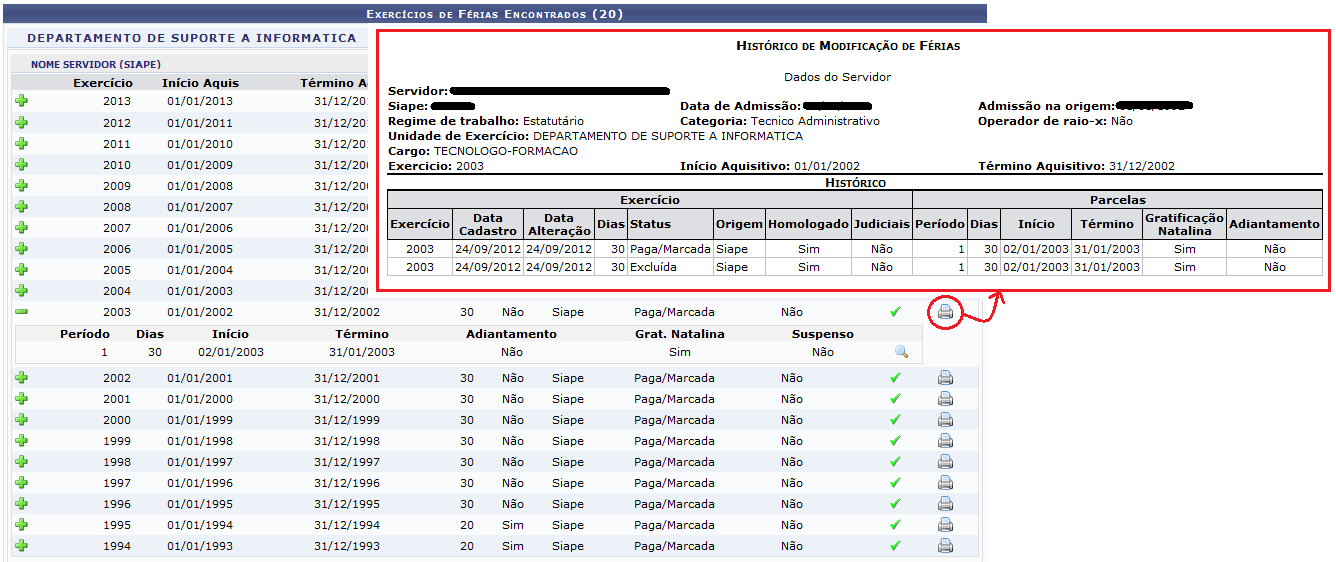 Antes da implantação em produção do SIGRH, a marcação das férias era feita de forma manual, ou seja, os setores preenchiam os mapas de férias da unidade em papel e enviavam para o setor de RH para que eles digitassem todos esses dados no SIAPE. O SIGRH está trazendo eficiência e agilidade no processo, deixando tudo de forma online. Além disso, foram importados do SIAPE registros históricos de férias dos servidores da UNIFEI desde o ano de 1994. É possível consultar no próprio sistema todo o histórico de modificação das férias dos servidores neste período, conforme imagem abaixo: