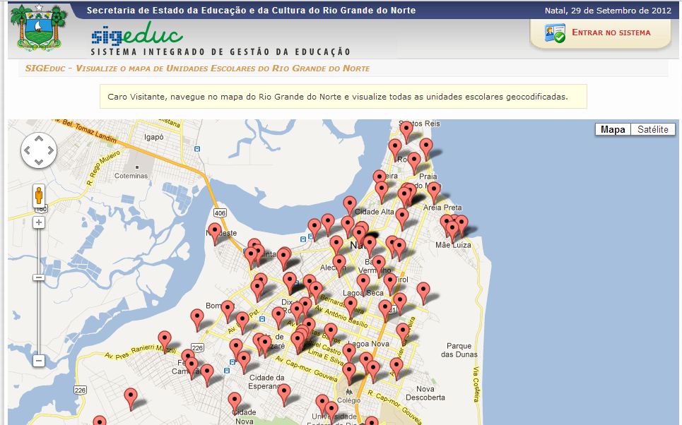 Nessa primeira fase do projeto, estarão disponíveis para as escolas no SIGEduc as funcionalidades relacionadas à matrícula online. O sistema também oferece um mecanismo de interação com a sociedade, através do seu portal público disponibilizando informações que podem ser acessadas pelo link do sistema http://sigeduc.rn.gov.br/ . Por esse portal, é onde os novos interessados em ingressar na rede estadual poderão solicitar sua matrícula, onde as escolas municipais poderão solicitar a matrícula dos alunos na rede estadual por questões de terminalidade (Transferência Automática), e onde o resultado do processamento da matrícula será divulgado. Além disso, as escolas da rede estadual foram geocodificadas, permitindo que as mesmas sejam visualizadas no mapa do estado do RN através de suas localizações, bem como consultar as escolas que estão localizadas próximo a residência dos estudantes.