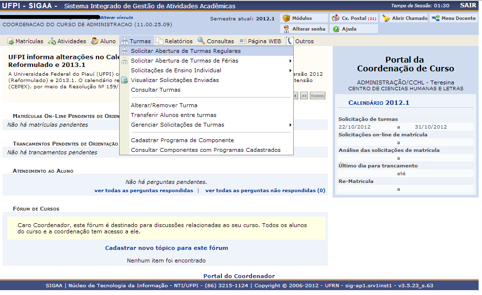 Em caso de qualquer dúvida, os servidores que trabalharem diretamente com a solicitação de turmas, entre os dias 22/10 e 27/10, podem acessar as vídeo-aulas de apoio na página do NTI (www.ufpi.br/nti), ou podem contatar a equipe de atendimento do NTI por meio do telefone (86)3215-1124.