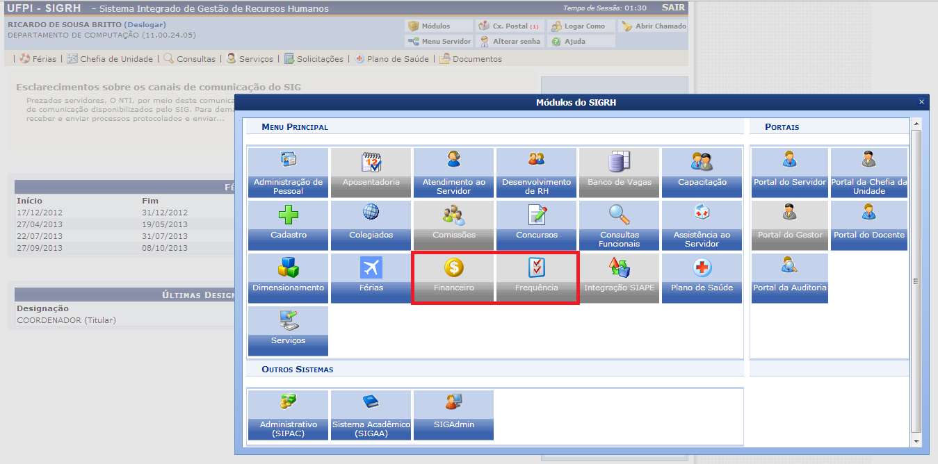 NTI da UFPI disponibilizou módulos de frequência e financeiro do SIGRH