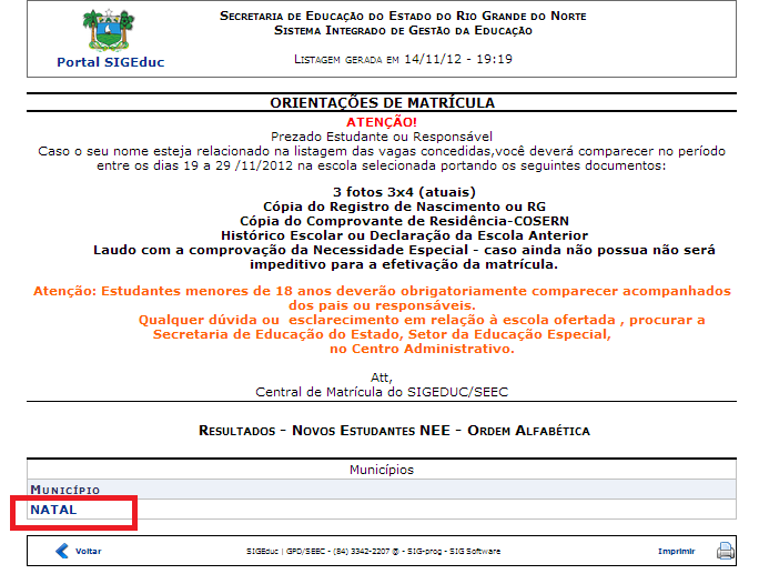 Para os estudantes das escolas de Natal/RN, que tiveram a matrícula online para 2013, a o resultado do processamento da matrícula encontra-se disponível no Portal Público do SIGEduc (www.sigeduc.rn.gov.br).